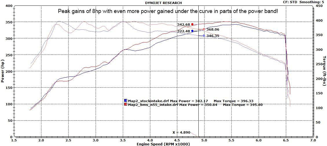 Unlike some manufacturers that advertise huge gains for their N55 intake systems, we're not going to tell you replacing the N55 intake will add 25hp+ because we've dyno tested them all and know they won't. But during our extensive dyno testing the BMS N55 Intake out performed all other available N55 intake systems posting gains of up to 10+ horsepower to the wheels. In addition to freeing up some power, turbo spool speed is improved. Not to mention incredible sound improvement. You'll finally be able to hear your turbo spooling!
