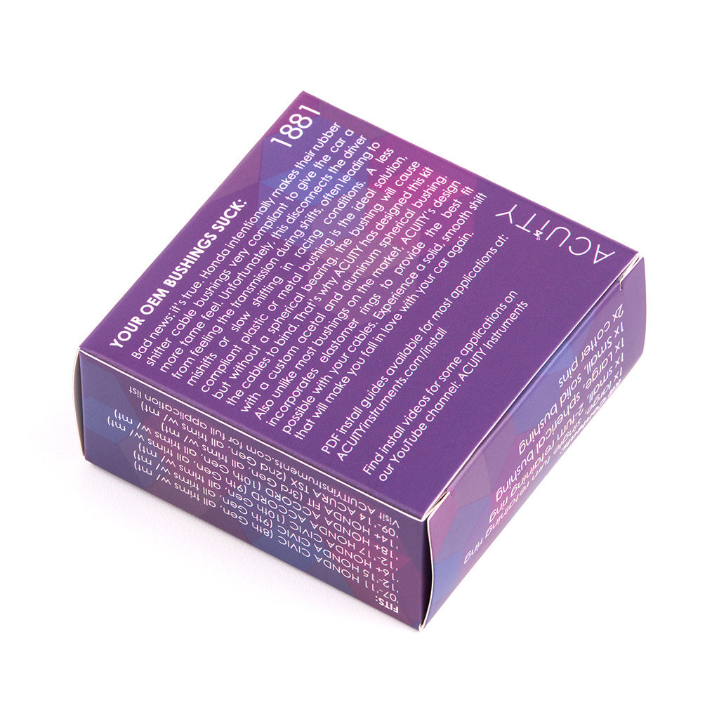Years of experience have taught the engineers at ACUITY that there are many elements to a refined, responsive shift. Compliance from flimsy components in the shift linkage leave the driver feeling detached from the transmission. ACUITY combats this by replacing the OEM rubber bushings with much stiffer Acetal and 6061-T6 Aluminum. A large-diameter, custom spherical bearing minimizes long-term wear and tear while eliminating the binding that is caused by most aftermarket solid shifter cable bushings. Loose fitting components also contribute to a poor shifting feel. That's why ACUITY uses integral o-rings on the outside of each bushing to provide a perfect fit with your OEM cables. Tested on street cars, track cars, and ACUITY's unreasonably violent shifter testing machine, these bushings are designed to be robust and proven to last. Each bushing kit is laser etched with a unique serial number and includes stainless steel hardware to help prevent long-term corrosion, keeping your bushings looking great even longer. And if all of that isn't impressive enough, the bushings are over 20% lighter than their OEM counterparts, weighing in at only 48 grams (with hardware).